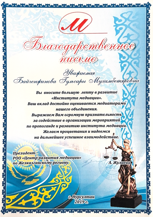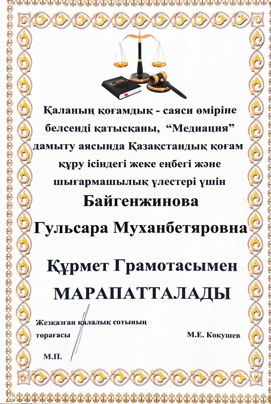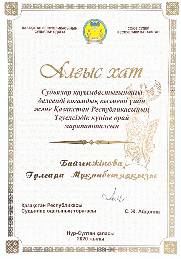 - Награждена знаком «Жеті жарғы» Союза судей Республики Казахстан за вклад в развитие судебной системы.