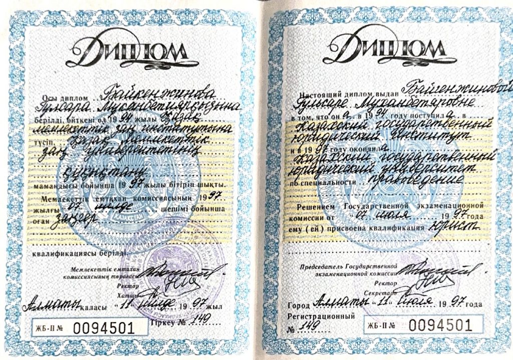 Специальность – Правоведение. Казахский государственный юридический институт (1997)