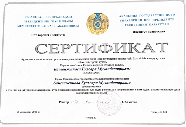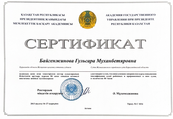Курсы Академии Государственного управления при президенте республики Казахстан; Академии Правосудия при Верховном Суде республики Казахстан